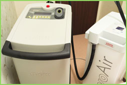 医療レーザー脱毛は脱毛効果が高い反面、ゴムをはじくような若干の痛みがあります。空冷機を使用して痛みを抑えるために、施術を行っています。